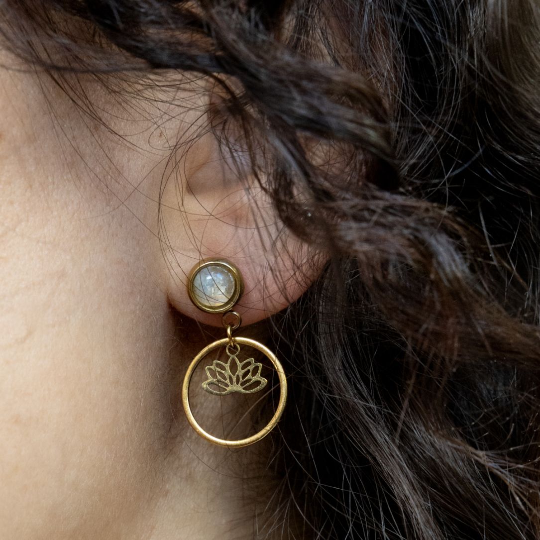 Sublimez votre visage avec les boucles d'oreilles Salomé, alliant l'éclat de l'acier doré à la douceur mystique de la pierre de lune naturelle.